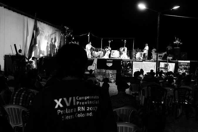 Ya en la oscuridad de la noche estamos con ganas de tomar algo que no sea mate y aporte frío y azúcar. Pensamos en parar en el siguiente pueblo, Sierra Colorada. Al entrar buscando un kiosco vemos que hay mucha gente en las calles, un animador y un escenario. Es el Campeonato Provincial de Esquila 2017 que se celebra en el lugar. Nos quedamos, pues, a ver y aprender un poco de este oficio y de sus técnicas que son las que se miden en la competencia. La gente es muy amable, como siempre, y nos explican en qué consiste el certamen. Se disponen los participantes y las ovejas sobre el escenario y comienza la tanda. Al final se lanza la lana a un contenedor y se juzgan la técnica y la calidad de ésta. Hay un ganador del campeonato, que dirige unas palabras al público agradeciendo entre otras cosas que su padre le haya enseñado a ser esquilador. Todo es seguido atentamente desde sillas y un palco ubicado en el lugar.