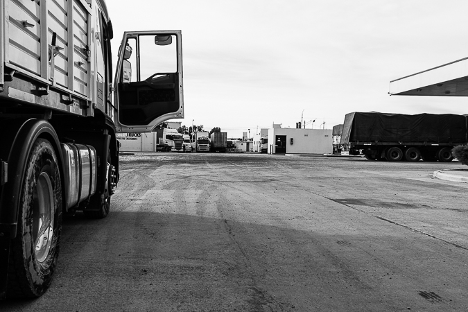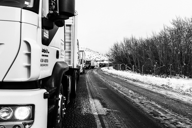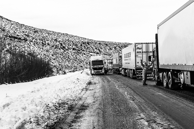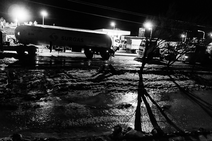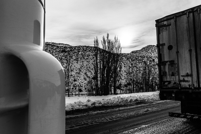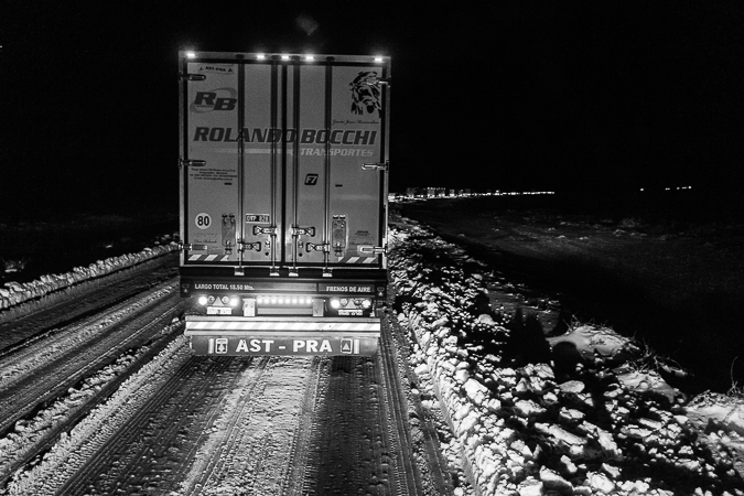 Garayalde. Chubut. 2017 © Leo MicieliAl parecer la travesía será larga. El hielo sobre el asfalto complica el tránsito. Es común ver toda clase de vehículos al costado de la ruta, volcados, chocados, abandonados hasta que alguien los saque algún día. La velocidad decrece en estas condiciones, pero más allá de Garayalde habrá que detenerse a 0 km/h y aguardar a que la cada vez más delgada fila de camiones avance cada tanto, a veces no más de diez o veinte metros. La travesía, y también la noche, serán muy largas.