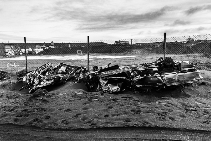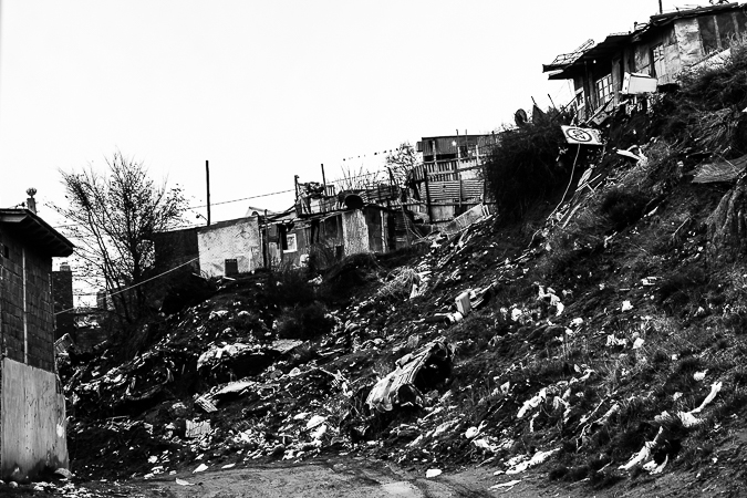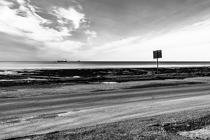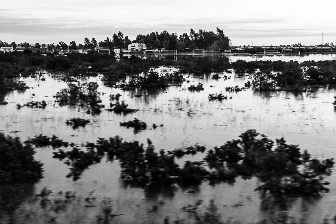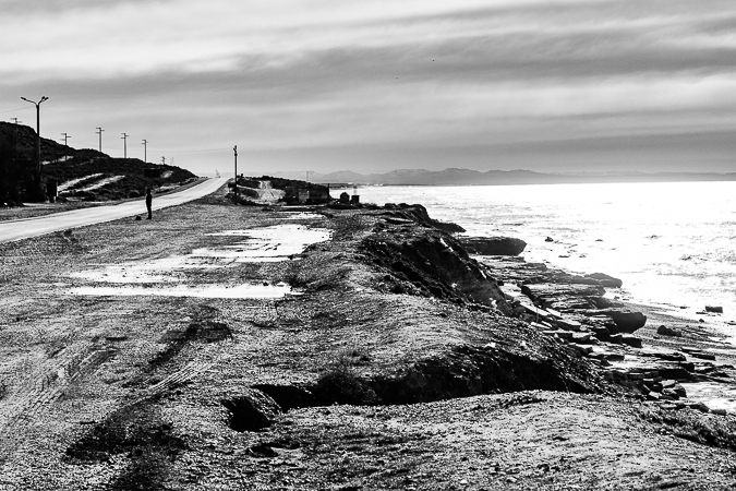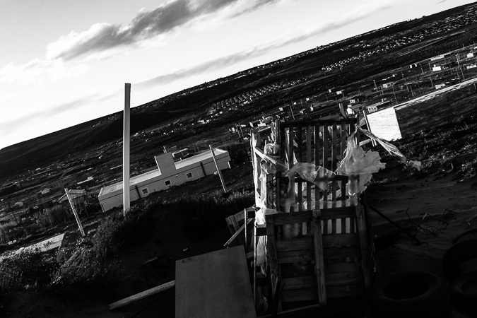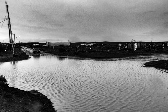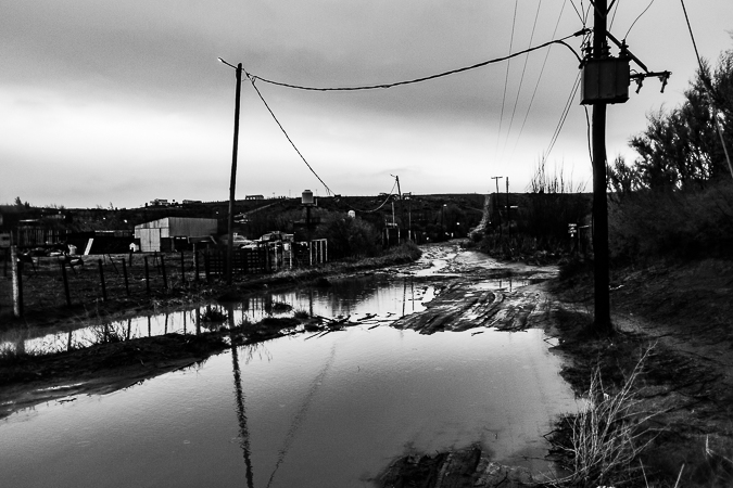 Cañadón Ferrays, Chubut. 2017 © Leo MicieliPasando el cañadón todo cambia de repente. Sigue el frío y la lluvia, pero se han ido la nieve y el hielo, el tránsito se ha normalizado, hay cierta fluidez. Entrar a Comodoro Rivadavia es, a casi veinte horas de haber salido de Trelew, una especie de oasis climático en esta situación, lo que es ya mucho decir puesto que no es precisamente la ciudad más amable en términos meteorológicos. No obstante esto es sólo una ilusión. La catástrofe ya se ha abatido pocos meses antes sobre esta ciudad que quedó bajo el agua luego de intensas lluvias que ampliamente superaron los promedios. Los efectos se notan en las calles y veredas, aún cubiertas por barro, las casas destrozadas y escombros, chapas y postes tirados por doquier. A mediados de los años noventa sucedió algo parecido: el Cerro Chenque fue la rampa por donde el agua bajó a raudales. Un geólogo afirma que ahora, gracias a las obras de prevención hechas en el cerro, la ciudad se ha salvado de consecuencias mayores.