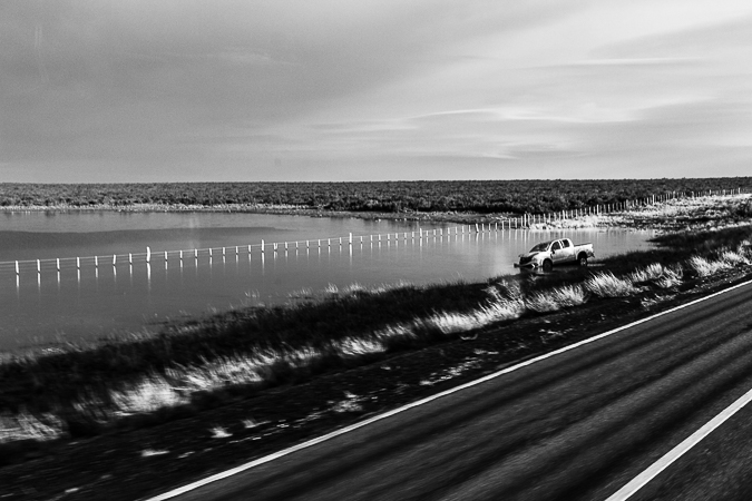 Ruta Nacional 3. Chubut. 2017 © Leo MicieliUn temporal afecta a la mayor parte de la Patagonia en los días de junio. El mapa satelital muestra un inmenso manto blanco cubriendo el territorio casi entero, apenas algunas franjas sobre la costa quedan a relativo resguardo de la nieve, pero no del hielo, de la lluvia, de los cortes de ruta. En algunos lugares ocurre todo lo anterior, y más. Hay inundaciones, casas destrozadas, colapso de servicios. El invierno se adelanta unos días y se impone sobre el ya habitual frío de este lugar. El último antecedente de un temporal así hay que buscarlo hace varias décadas atrás. Las dudas hacen pensar si continuar adelante o no. Sin embargo, el viaje continúa. Qué duda cabe, si todos los viajes son siempre de ida.