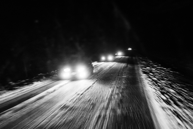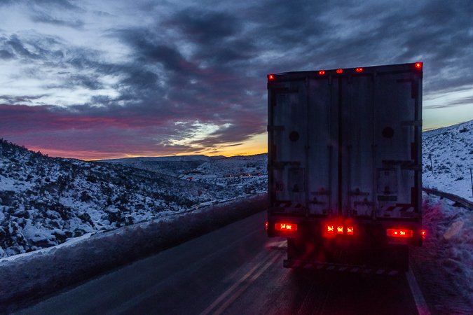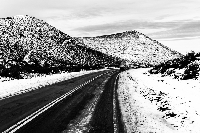 Cañandón Ferrays, Chubut. 2017 © Leo MicieliLuego de varias horas hasta el amanecer aún no hemos llegado a Comodoro Rivadavia. Falta poco, tal vez unos 20 kilómetros, pero en la bajada del Cañadón Ferrays hay mucho hielo sobre la calzada y los vehículos deben transitar con extrema precaución además de cadenas. Por la altura y el viento es un lugar propicio para que se generen estas condiciones que con frecuencia producen graves accidentes.