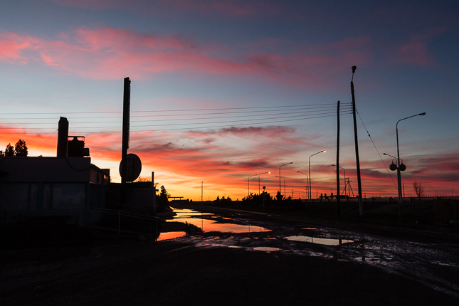 Puerto Deseado. Santa Cruz. 2017 © Leo MicieliBreve y obligado paso por Fitz Roy para volver a la Ruta 3 y encarar franco hacia el sur. No pasan más de veinticuatro horas desde el arribo hasta la salida. Sin embargo, este lugar de aproximadamente cuatrocientos habitantes permite apreciar un hermoso atardecer, charlar con el amable personal de la estación de servicio y seguir confiado hasta el próximo destino.