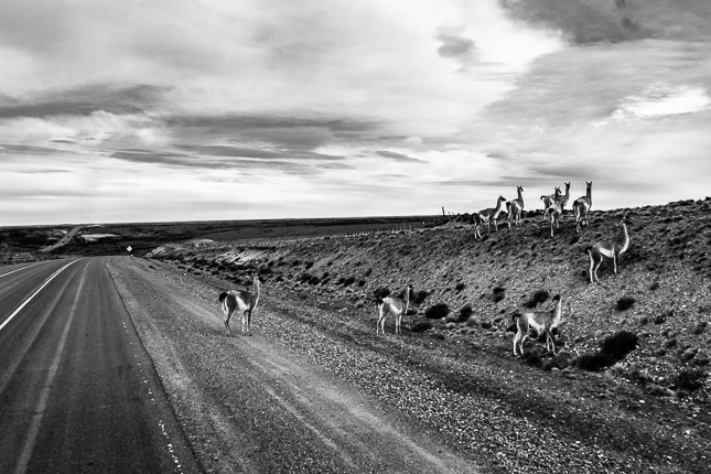 Guanacos sobre la Ruta Nacional 3. Santa Cruz. 2017 © Leo MicieliEl panorama cambia unos pocos kilómetros antes de llegar a Río Gallegos. Los pueblos y localidades costeras y sus aires serenos quedan atrás. Como suele ocurrir en las grandes ciudades o capitales los ritmos son más rápidos, las edificaciones crecen en altura, el ejido urbano se extiende en superficie, la gente se vuelca hacia la rutina y la inercia, las diferencias sociales son más marcadas.
