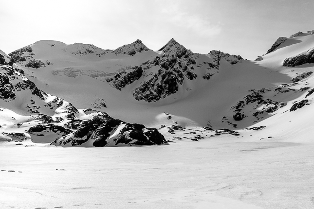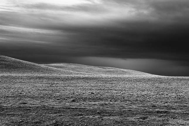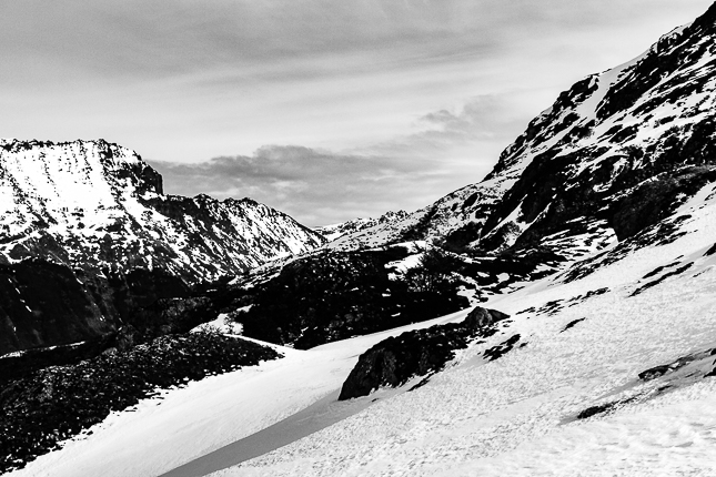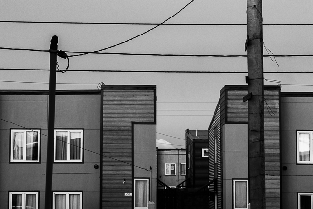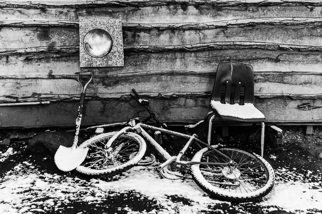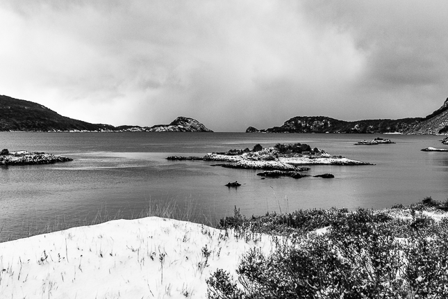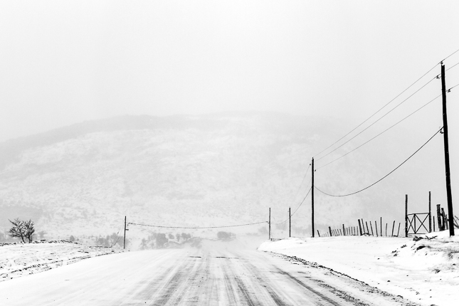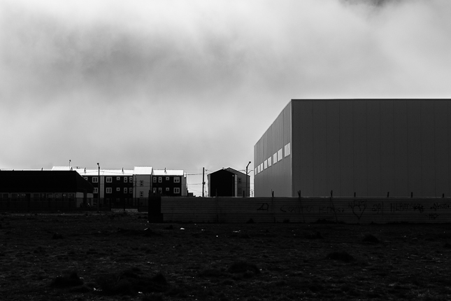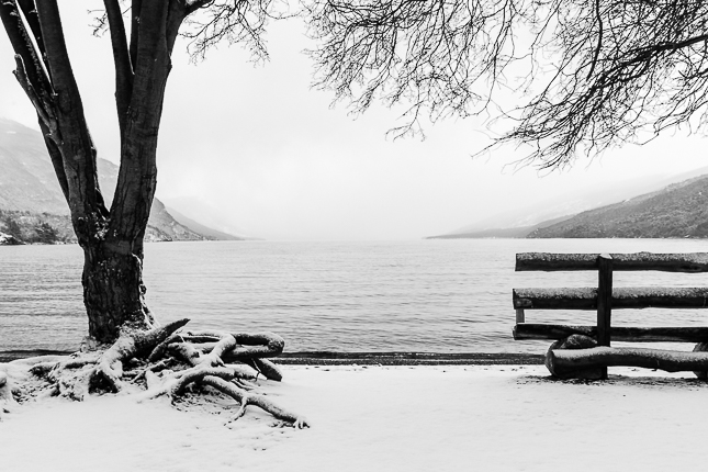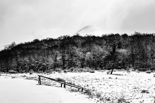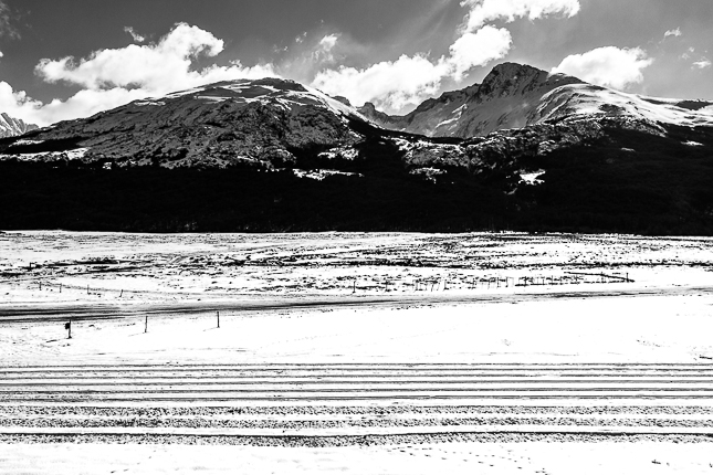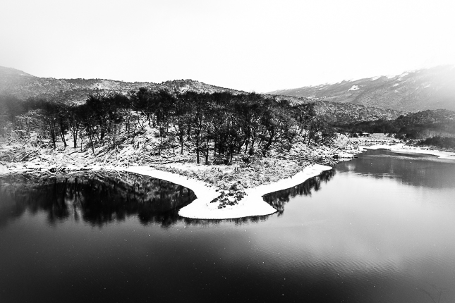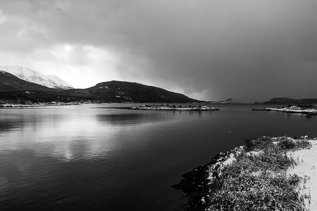 Durante la noche anterior y la mañana nieva. Estoy parado en este extremo del planeta en donde también todo es extremo. Recorro el paisaje con la mirada y es como ver en blanco y negro, los colores desaparecen porque no son necesarios, el contraste es tan alto que todo parece dibujado al carbón, la brusca geografía queda sutilmente delineada con pocos trazos y pinceladas difusas.
