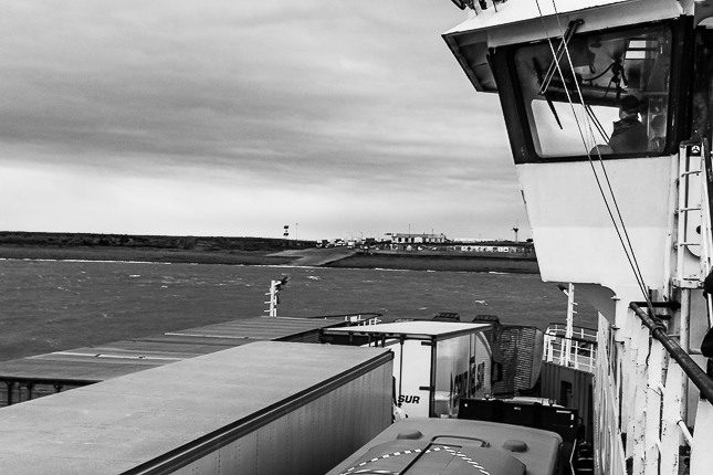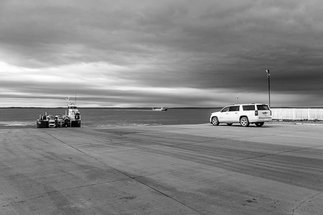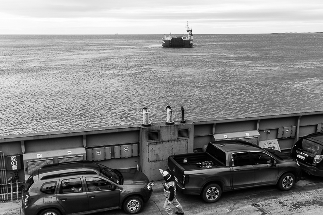 El trayecto hasta la isla desde el piso superior de la barcaza envuelve el viaje de una sensación de helada calma, a pesar de las agitadas aguas y el eterno viento que hay en el estrecho. Se ve alejarse lentamente la orilla continental, a mitad del recorrido ambas márgenes se perciben como dos pequeñas líneas apenas irregulares, mientras se observa la llegada al otro lado de la angostura con los vehículos que esperan a subir. A los costados, el tono azul-verdoso del mar y algunas toninas que acompañan la trayectoria de la balsa. El balanceo a bordo y el aire frío que corta la cara, más que incomodar traen paz en el tiempo que dura el cruce.