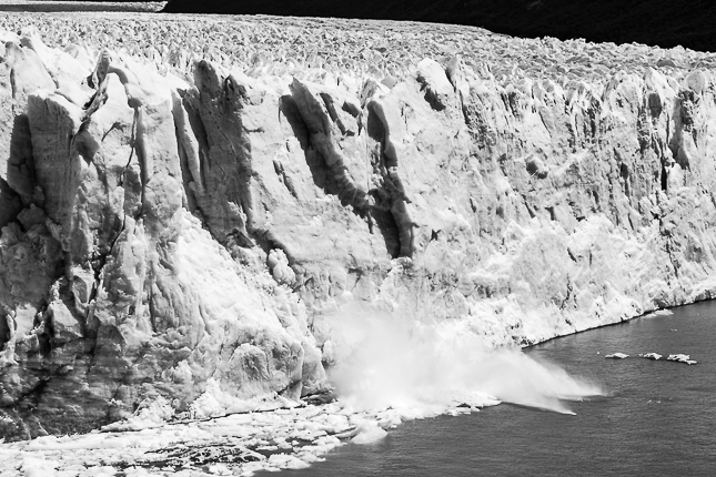 Desprendimiento de hielo. Glaciar Perito Moreno, Santa Cruz. 2018 © Leo MicieliLlegar a este punto en el marco de mi viaje implica para mí conocer el principio y fin del Río Santa Cruz. El Glaciar Perito Moreno es uno de sus afluentes y desemboca en el estuario que baña las localidades de Cmte. Luis Piedrabuena y Puerto Santa Cruz, lugares en donde pasé varias semanas hace unos meses atrás, dejando sus aguas finalmente en el Atlántico. El río recorre 385 km sin tomar en cuenta sus afluentes más lejanos. Es en esos pueblos donde fui puesto en conocimiento de la intención de construir dos represas sobre el curso del río, afectando de forma determinante el ecosistema y provocando daños ecológicos, económicos, sociales, de manera irreversible.